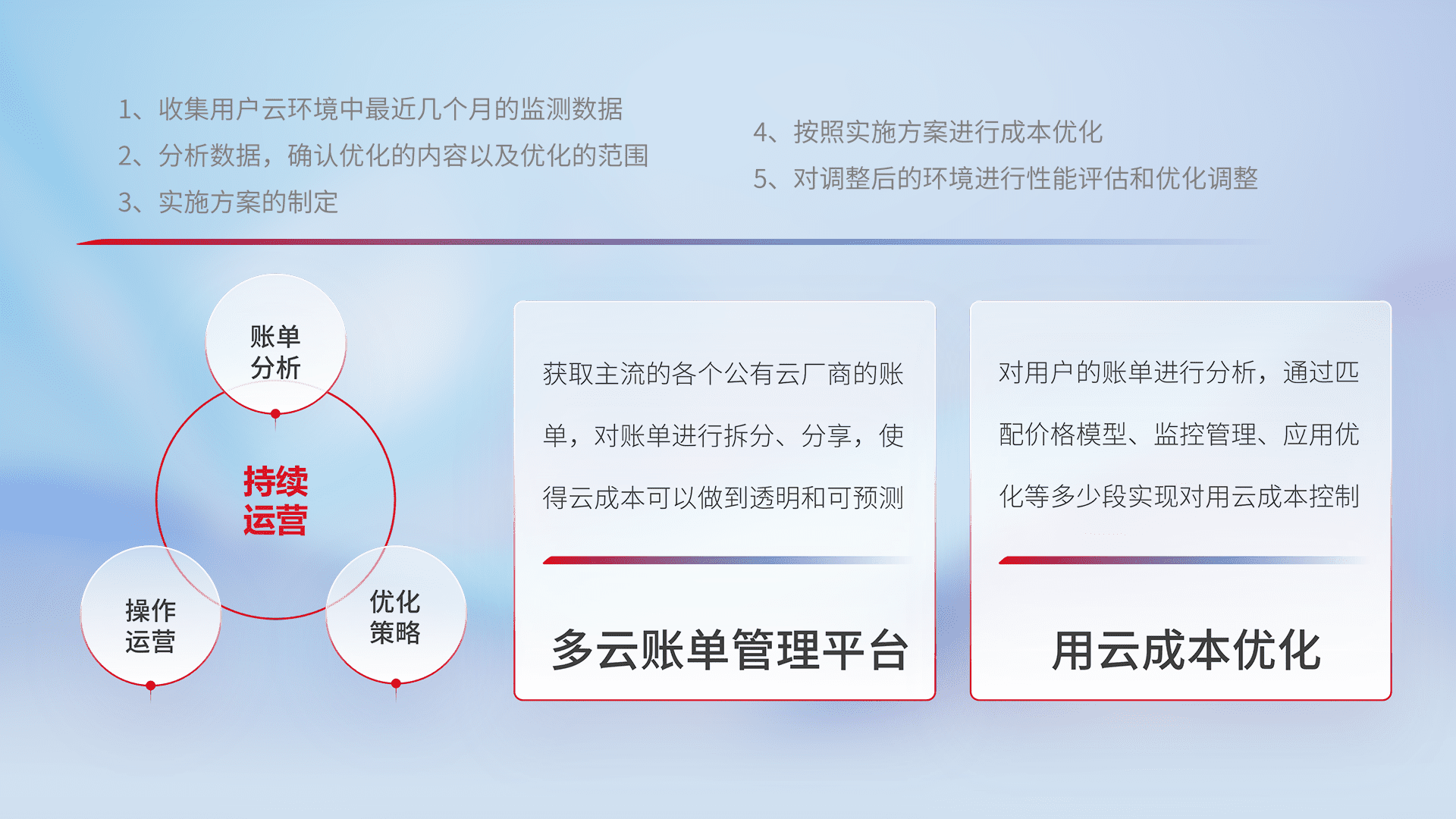通过多云纳管,,,以统一的资源数据模型把客户的云资源进行抽象和封装,,,,进而实现对多云资源的统一操作,,,,保障云资源管理的可靠性、、、稳定性与可用性。。。量身定制化运维内容,,,,配置、、开发运维、、、、补丁管理、、、备份、、、、监控、、、、认证和访问管理、、审计和日常巡检等,,保障在用云过程中的可靠度,,,稳定度以及高可用率。。